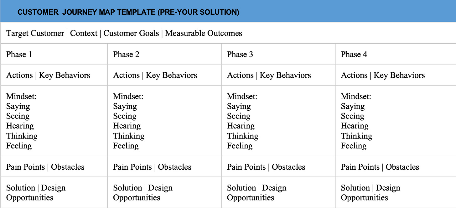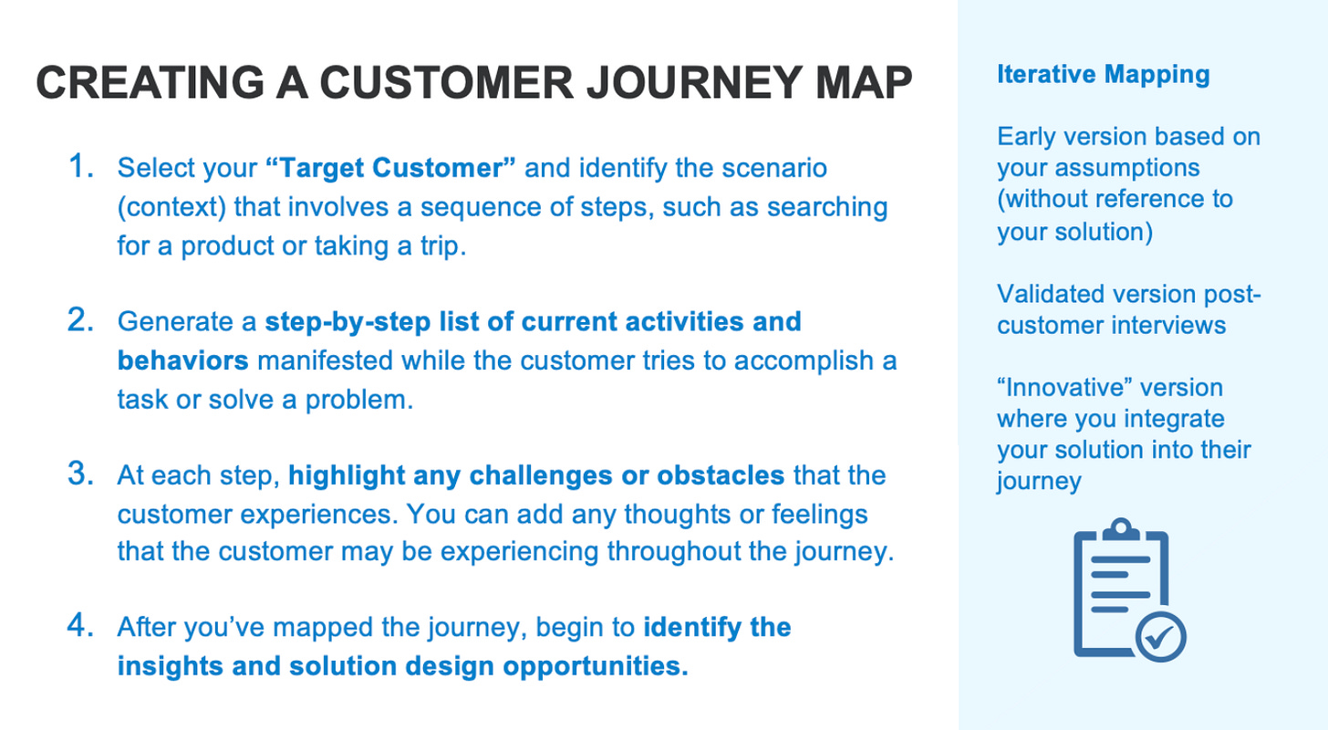 One of the best things about customer mapping is that you can build on it as you continue to engage customers and associated market research. First, through customer discovery, you learn more about their current experience. Then, you can work with your team to generate potential solutions and finally help document experience with early product experiments and prototypes.
