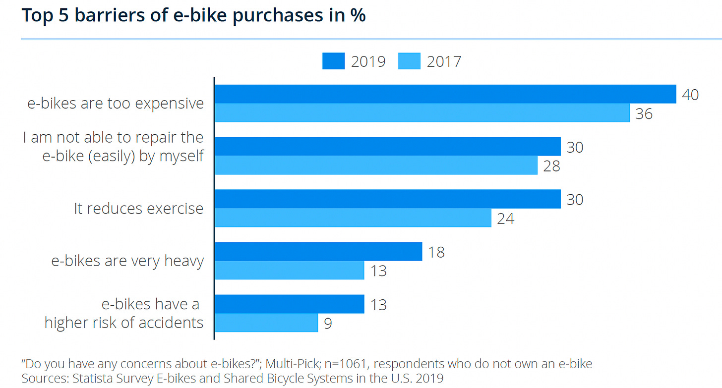 As part of growth trend analysis, you want to look for secondary patterns that might influence industry performance. One specific pattern in the bicycle industry is the growth of the direct-to-consumer business, moving bike sales outside of the traditional local bike shop. In general, there is a growing emphasis on direct-to-consumer brands. Bicycles and e-bike D2C brands are following this growth trend. One of the significant trends in this market is the growth of direct-to-consumer brands, most notably Rad Power Bikes and Aventon. These D2C brands are popular and show strong growth in the U.S. market. Developing this segment is essential for an entrepreneur looking to build an e-bike service business. Most of these companies ship e-bikes that are partially assembled and, even post assembly, need a thorough inspection before road-ready. While the companies claim they are almost ready to go "out of the box," so far, that seems valid. One of the main reasons people avoid purchasing e-bikes is the concern about the assembly and the inability to do the repairs themselves.