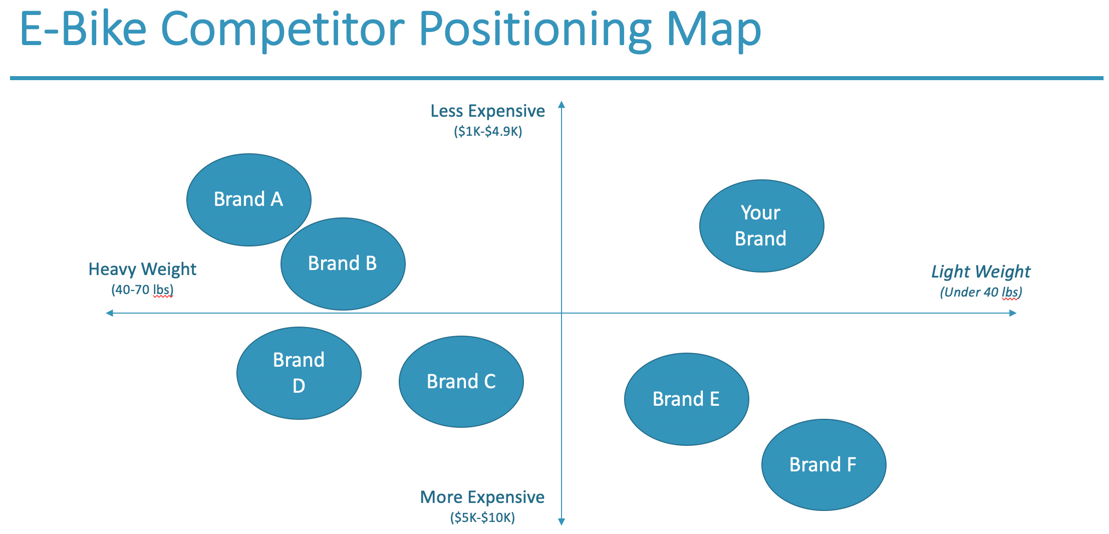 The final step is to place competitors who offer bikes to urban commuters in the quadrant that best describes their position. Some competitors will have lightweight bikes but at premium prices. Other companies may provide heavier bikes at lower prices. If this is the case, you will want to develop an e-bike that is light and comparatively inexpensive (most likely not an easy design to accomplish). If you can design such a product, you will be well-positioned to compete with the urban commuter bike buyer.