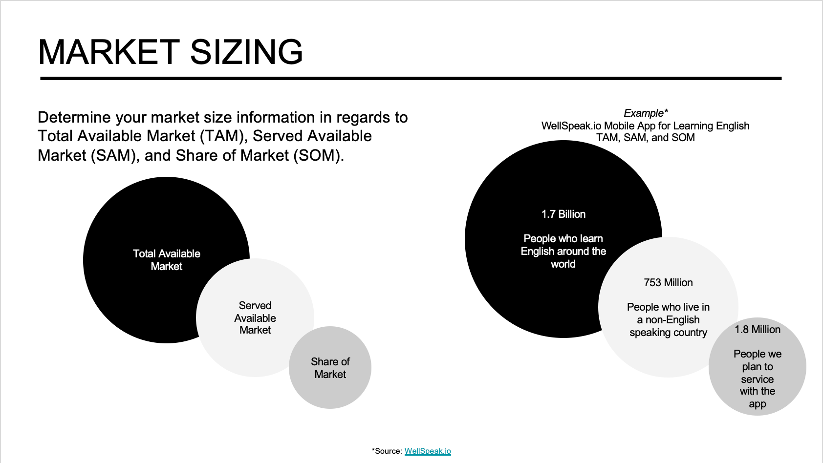 The marketing section must establish a demand or need for the product or service and define both the market and the potential opportunity. Many founders apply a framework that defines the total available market (TAM), served available market (SAM), and share of the market (SOM). I recommend conducting a bottoms-up analysis only on your target customer (beachhead). In this scenario, the TAM estimates how many target customers, as defined by your profile, exist within your geographic boundary. SAM further delineates your market by customers actively searching for a solution to said problem. Finally, SOM estimates how many of those SAM customers you can reach and acquire in the first 1-3 years of operation. You refine your SOM estimations once you have a customer acquisition strategy and understand operational constraints.
