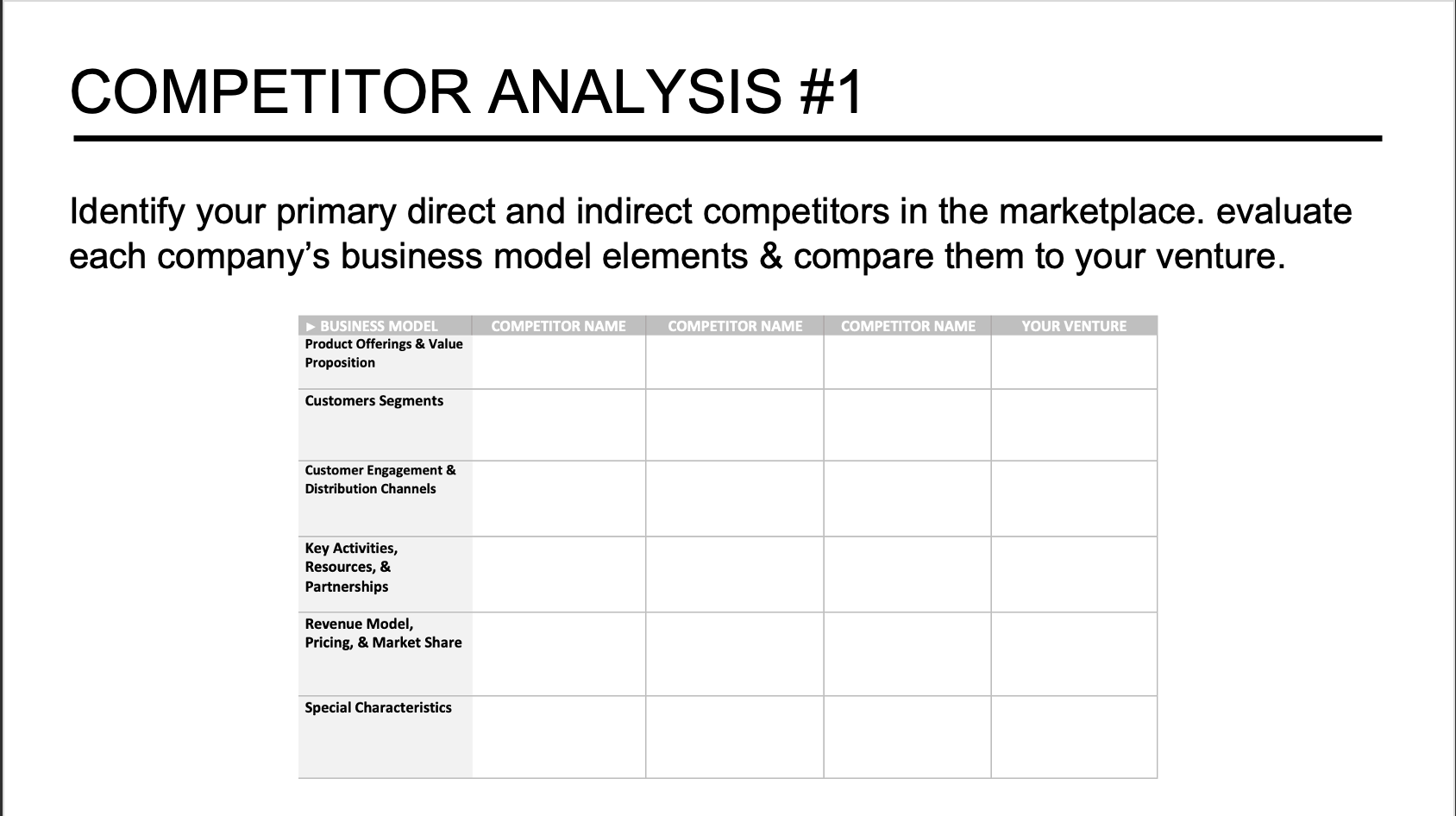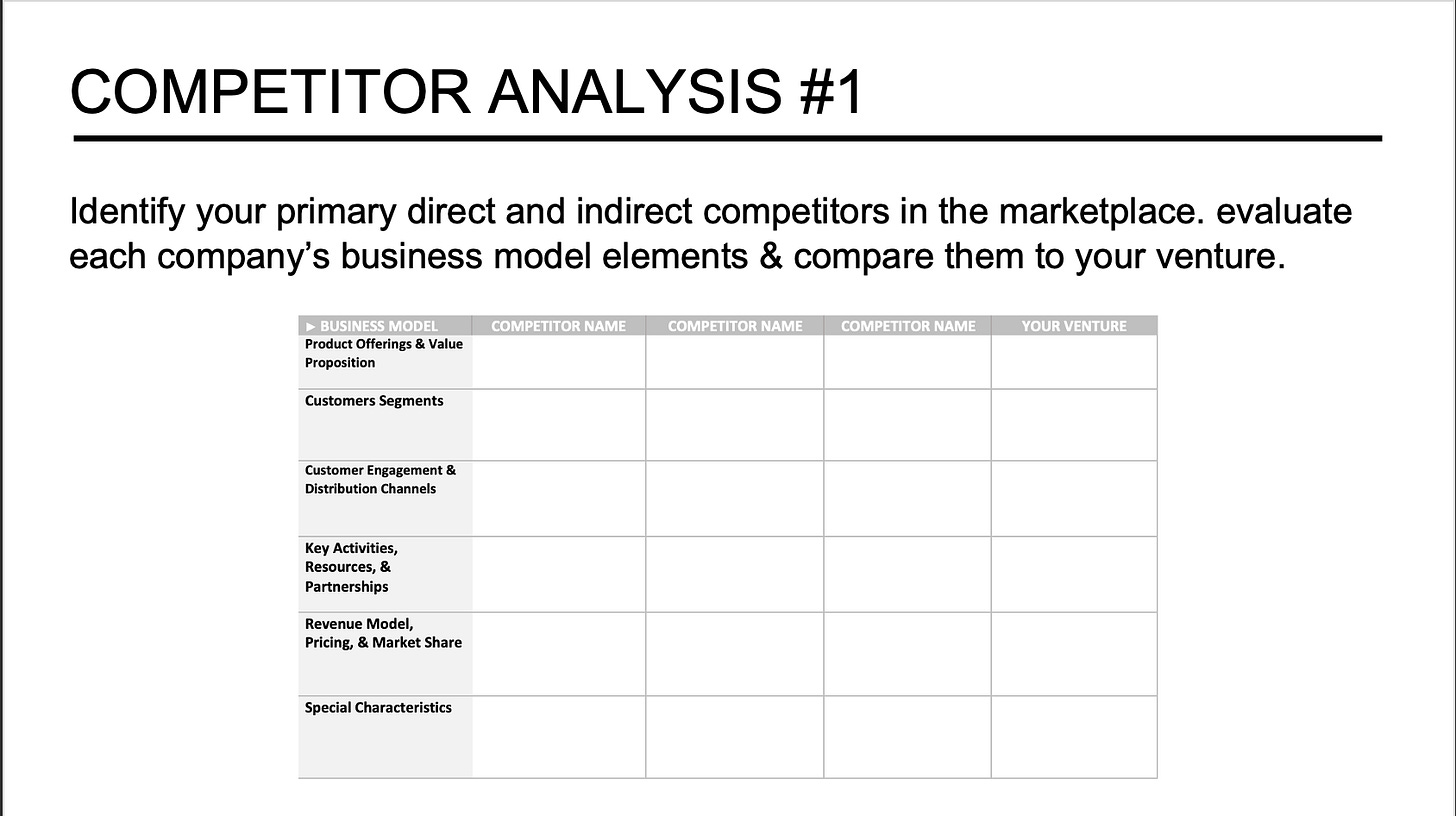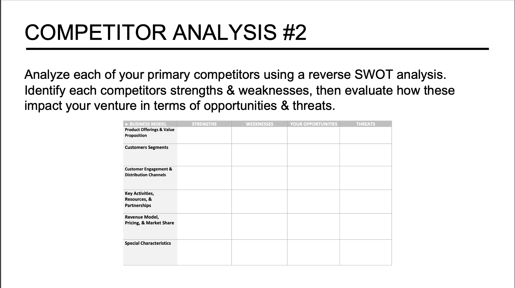 The market research section should describe the conditions in the business, including the degree of competition and what impact this competition will likely have on the company. Addressing other forces, such as government regulations and outside influences, is also essential. To support the development of your competitive strategy, you first identify your primary competitors and then analyze their strengths and weaknesses. The first step of the analysis is to investigate the business model elements of each competitor and compare the results to your venture's model. The second step is to conduct a reverse SWOT analysis to determine each competitor's strengths and weaknesses and translate these findings into potential opportunities and threats to your venture. This type of analysis leads to your market entry strategy.