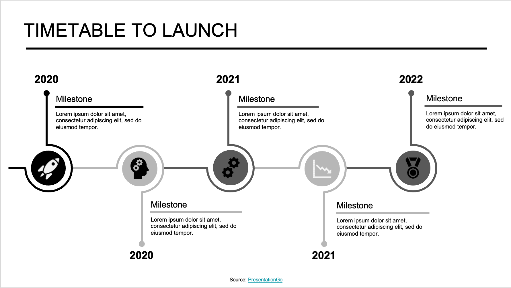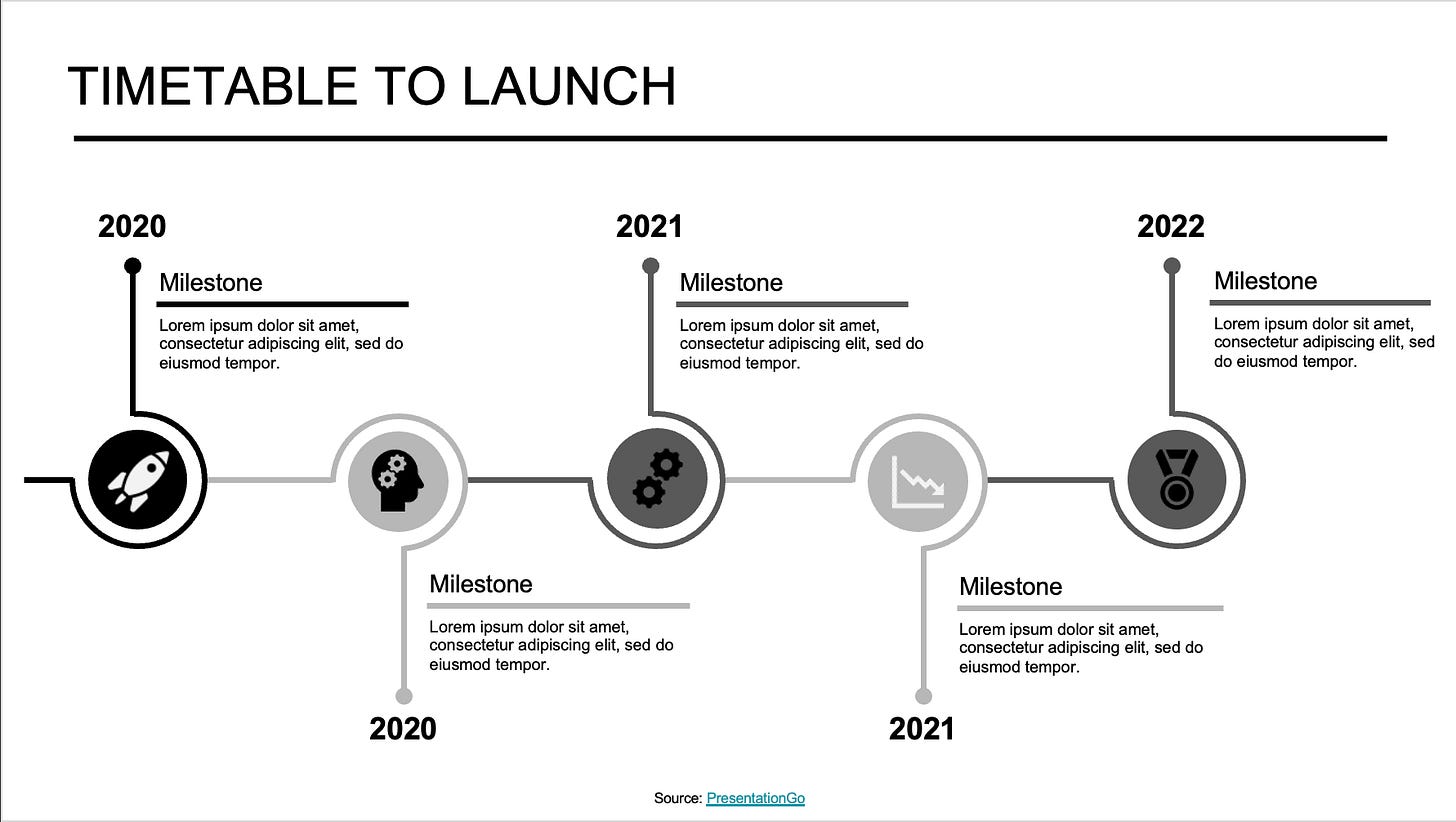 In this final slide, founders can offer information about essential goals and associated milestones relative to the current period. These milestones relate to major strategies and actions critical to the venture's stage of development. The focus may be product development testing iterations or steps towards market entry and early traction. If providing this information to investors, it may include funding rounds integrated with growth milestones.