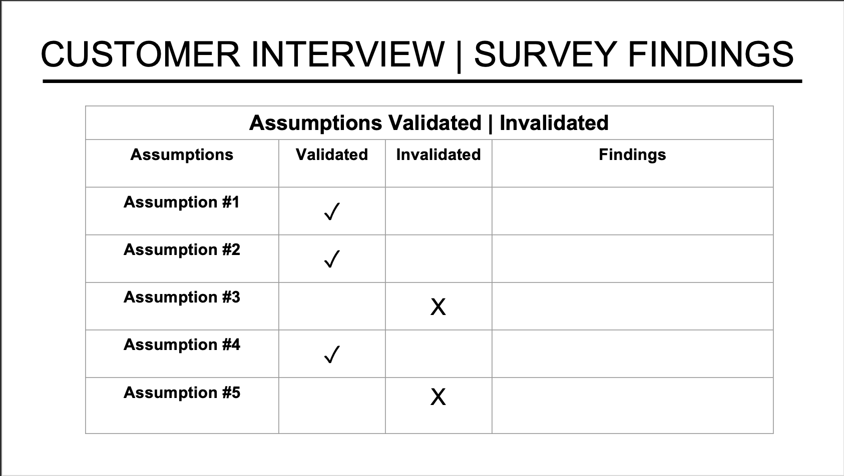 A final slide in this section focuses on what you have learned from your customer discovery interviews and surveys. You should include the number of customers and any relevant target demographic data. The slide should highlight critical findings that validate or invalidate your early assumptions about the target customer, the presenting opportunity, pain points, and desired outcomes. You can list your premises and provide an ✓or X validation status.