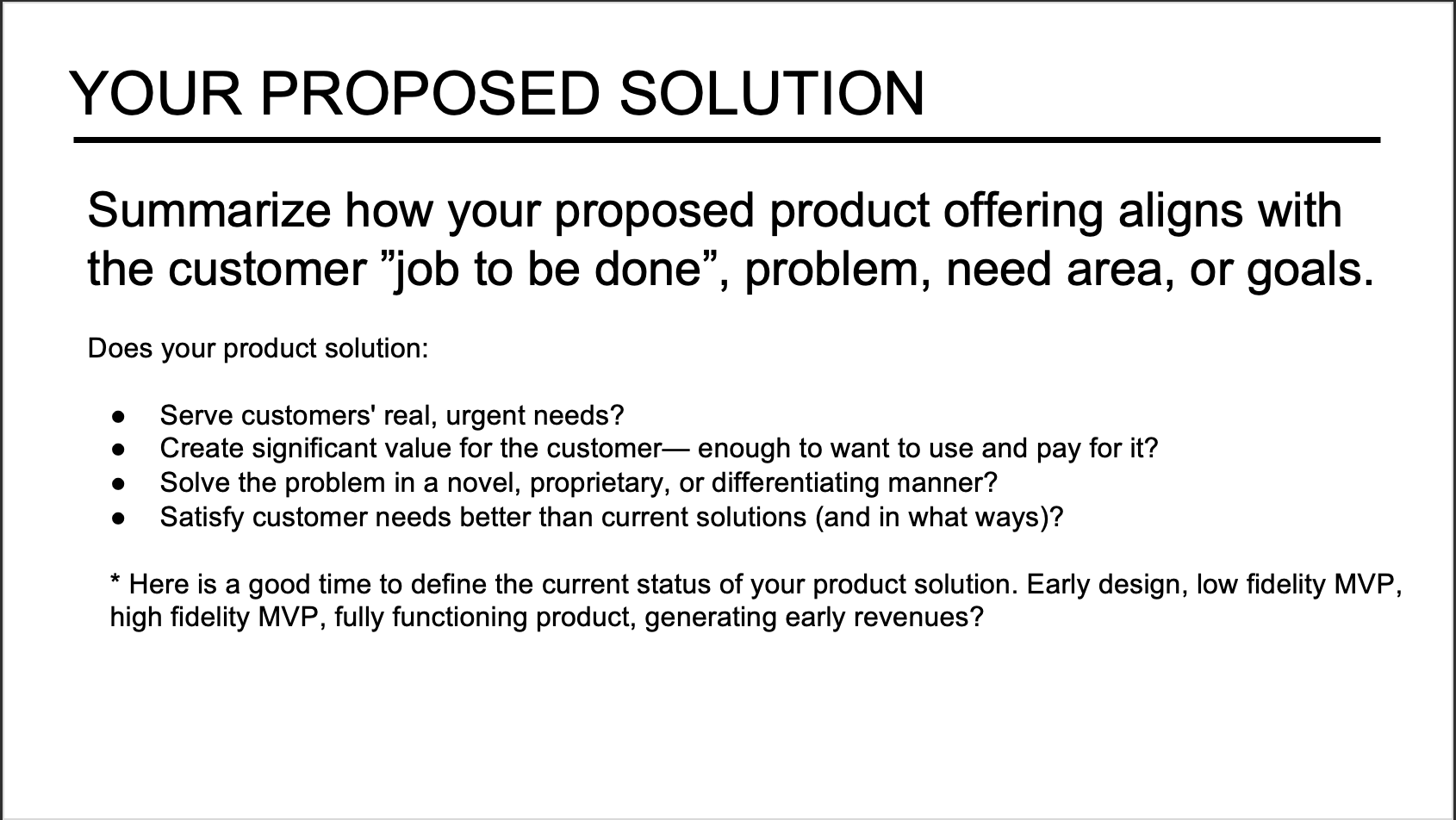 Then, a brief description of how the venture plans to solve the customers' problem highlights the proposed product offering, its benefits, and overall value to the customer. These early slides should give insight into what stage the company has reached. Is it a seed-stage company without a fully developed product line? Has it developed a product line but not yet begun to market it? Or is it already selling its products and anxious to expand its scale of activity? It is essential to be transparent about the status of your startup development.