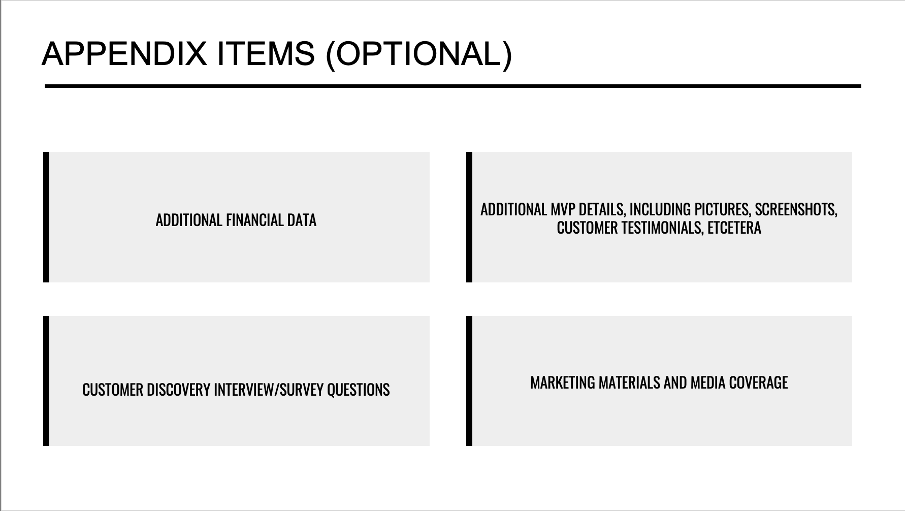One subject that can be very beneficial is to include the customer data and analysis from your customer discovery and MVP testing activities. For example, for the customer discovery interview section, provide detailed information on customer interviews, including demographic data about the interviewees, details of customer discovery interviews (including all protocols, scripts, and survey questions) focusing on validation and invalidation findings on core assumptions, and a summary of what you learned and changed based on these early customer interviews.