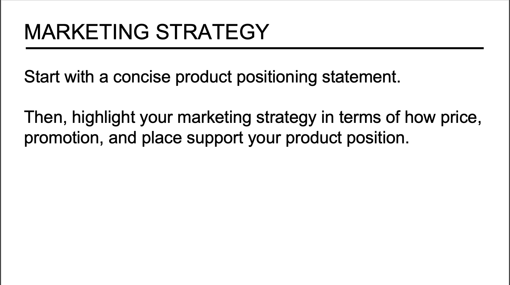 Then, you can highlight how pricing, promotional activities, and placement channels support your product positioning. Pricing is essential in marketing because it directly impacts the business's success. The reading deck's marketing and sales strategy section should address policies regarding discounting and price changes and their impact on gross profit (revenue less cost of goods sold). When considering what price to charge, it is essential to realize that price should not be based entirely on cost plus some profit. Instead, consider various pricing methods and strategies to generate the necessary profits for the business. You must align your placement strategies with both your pricing and promotional strategy. Ensure to highlight the primary placement channels you will use to reach your customer throughout the sales cycle - from initial awareness to post-purchase service.