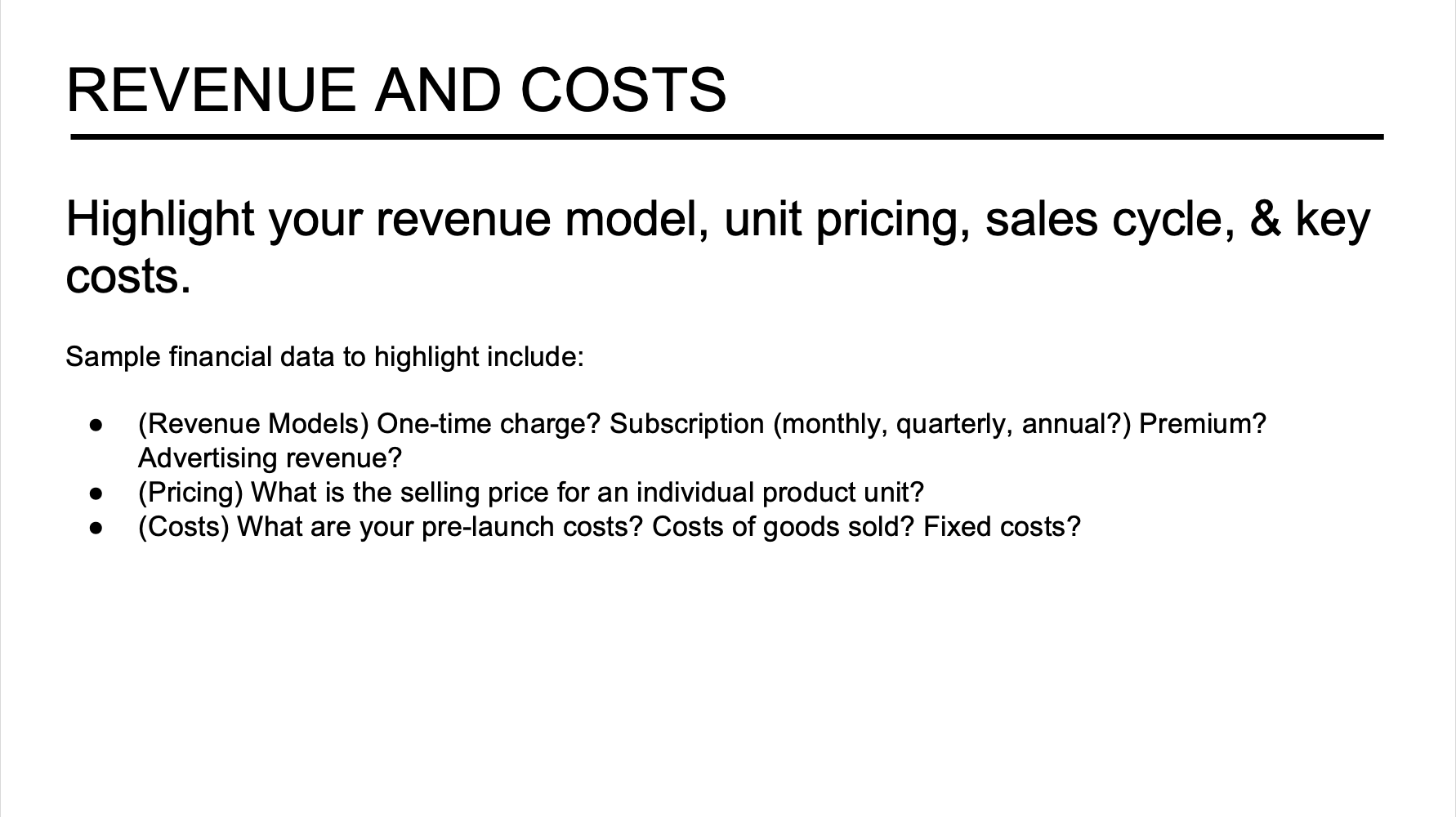 The reading deck highlights three financial areas: critical financial highlights, startup metrics, and fundraising strategies. Key financial highlights come directly from the results of your projected financial statements. You can highlight projected sales, sales cycles, unit pricing, and critical cost areas using graphs and charts.