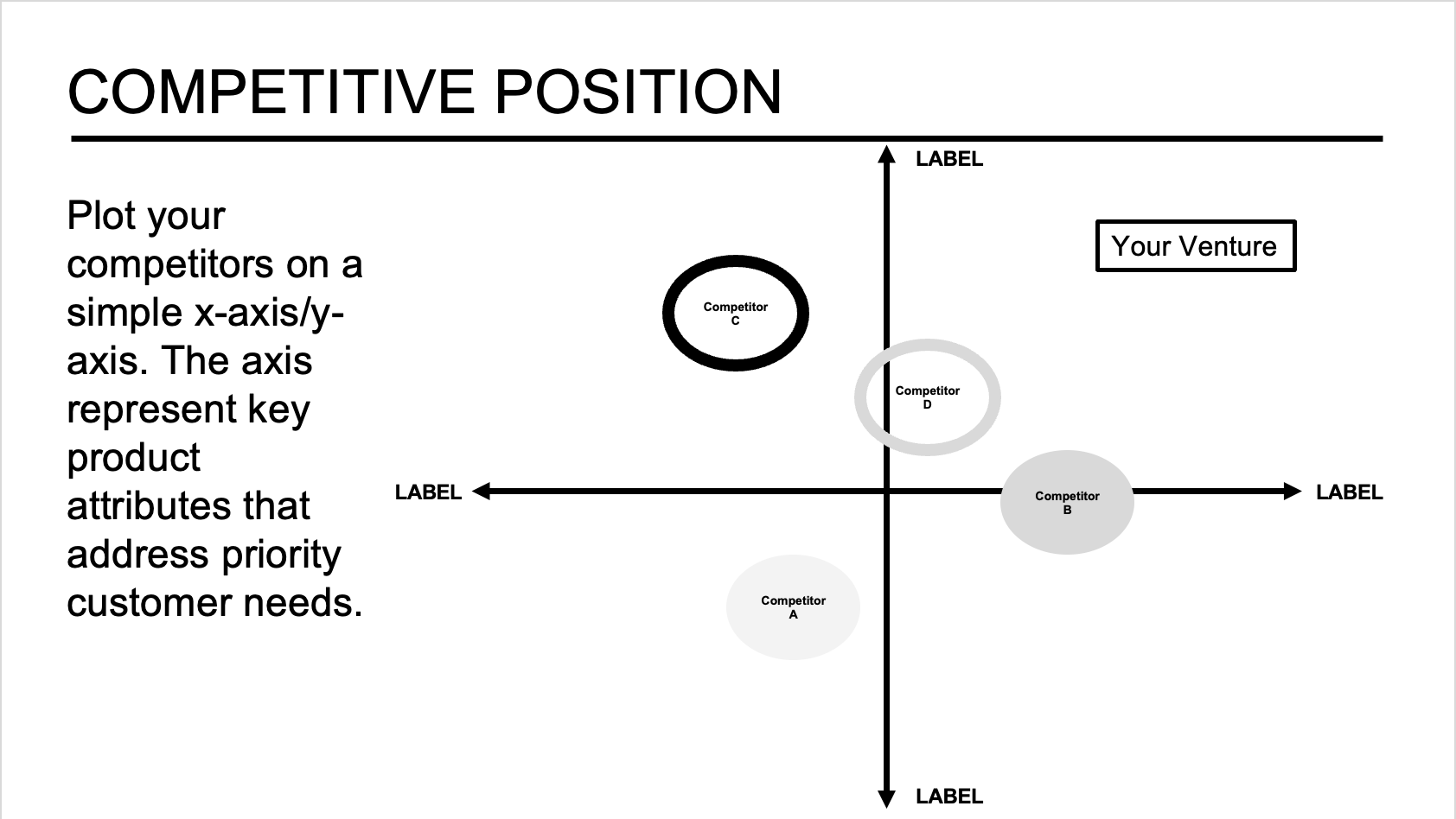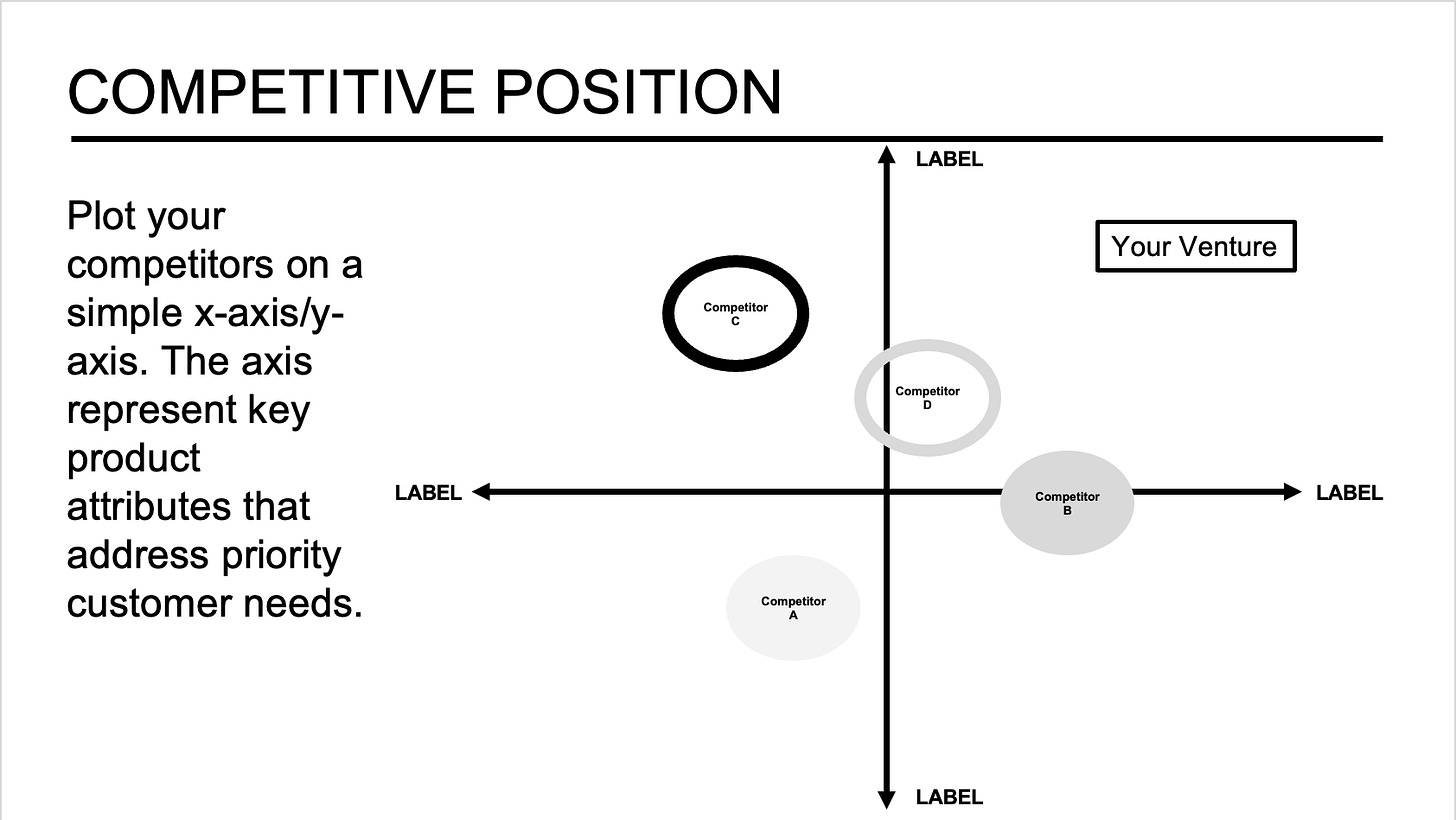 One way to illustrate the current competitive landscape and your strategy to enter the market is through what is called a positioning graph. Typically, founders select essential product attributes that address vital customer concerns. The rationale for choosing said attributes is that the founder believes the selected characteristics set them apart from the competition.