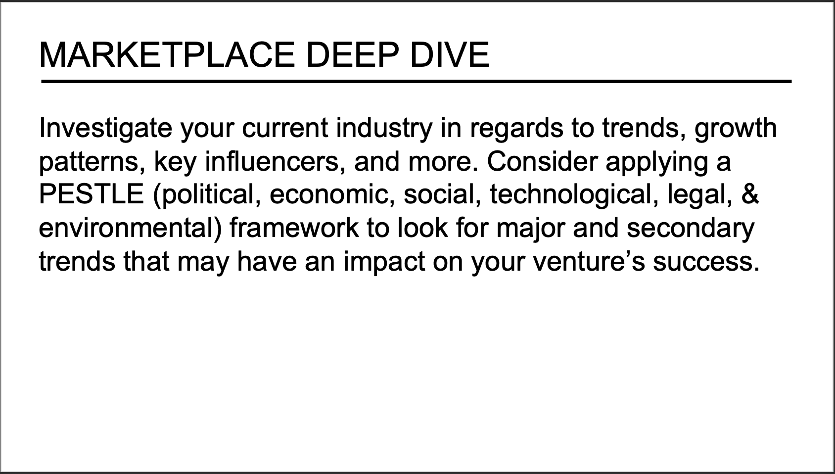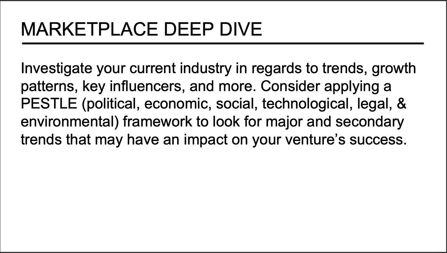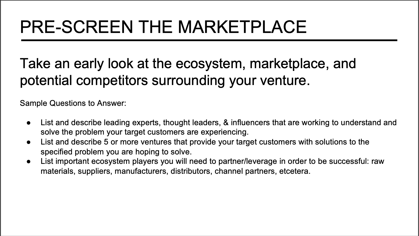 Another slide to add to the opportunity section allows the founder to document early pre-screening of the marketplace. I find that many new entrepreneurs come into an idea with minimal understanding of the dynamics of the industry and associated ecosystem. What are the major industry trends? Is it growing, segmenting, or declining? Who are the leading domain experts, thought leaders, and influencers? Who should you be following on social media, reading their writings, and potentially connecting with them at some point in the venture's development? Finally, founders should take an early survey of the competing solutions in the marketplace. This information helps founders evaluate the market's attractiveness and the nature of the current activity to solve the customers' needs.