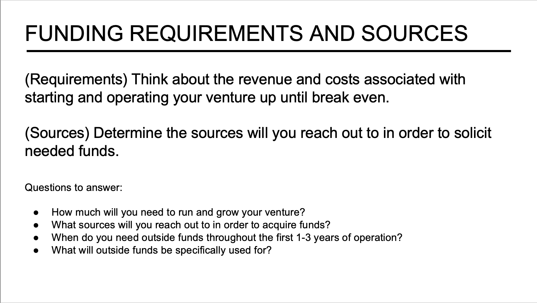 Fundraising Requirements. The funding section of the reading deck should describe how much money is required to finance the business, the uses of the funds, and when the capital will be needed. To determine financing requirements, entrepreneurs must evaluate and estimate the funds required for (but not limited to) research and development, purchases of equipment and assets, and working capital. For example, to finance the research and development of a product, entrepreneurs might experience a long delay between incurring research expenses and generating sales. Thus, it may be appropriate to fund these expenses with long-term financing. The content in this slide coincides with financial data noted in earlier slides and the financial statements in the appendix.