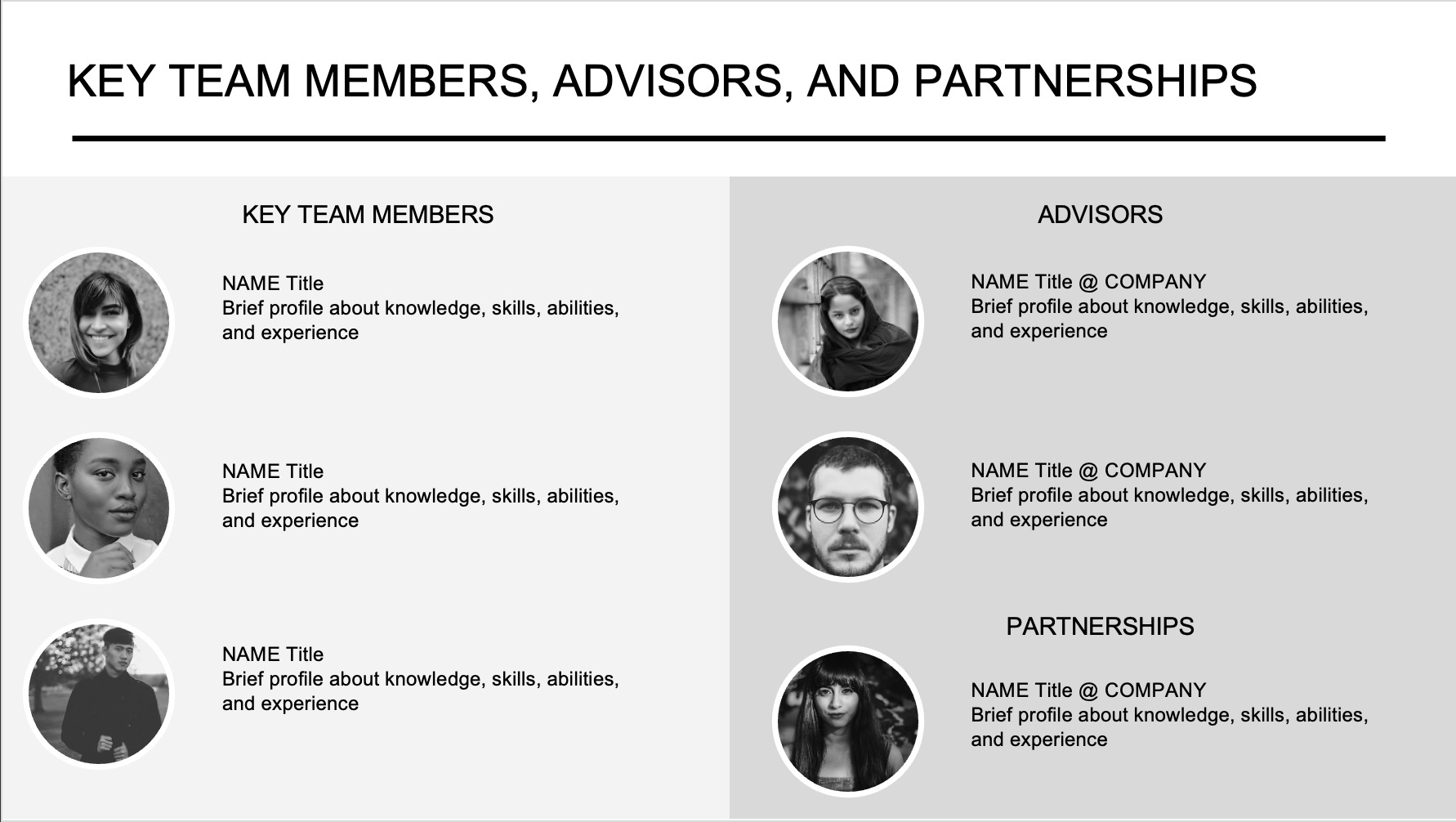 You should detail the startup team's talents and skills in this section of the reading deck. If the business plan is to attract investors, this section should emphasize the team's talents and indicate why this management will help the company have a distinctive competitive advantage. Entrepreneurs should keep in mind that individuals invest in people, not ideas. Detail the expertise, skills, and related work experience of the proposed founding team and the backgrounds of those expected to play critical roles in the venture. These include investors, members of the board of directors, key employees, advisers, and strategic partners.