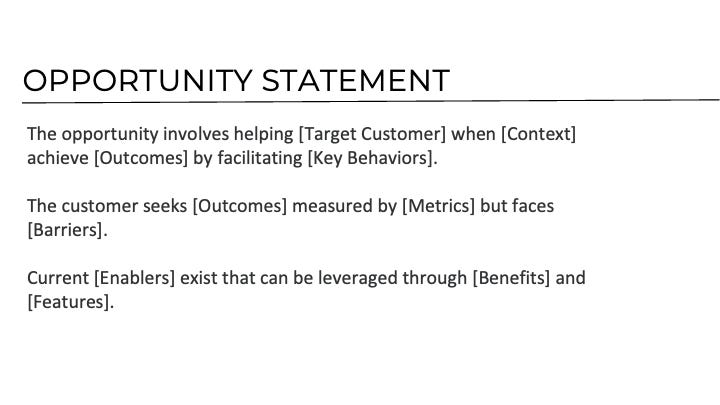 An excellent place to begin is to describe the opportunity you hope to solve for the customers. What does the customer need, and why can they not meet them? This section should describe the customer experiencing the problem the most, the context of the experience, and articulate what key behaviors will facilitate desired outcomes. I suggest that you use the opportunity statement template to support your thinking at this point.